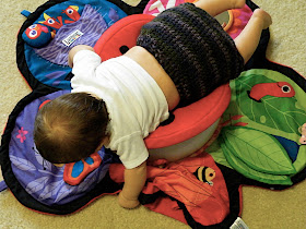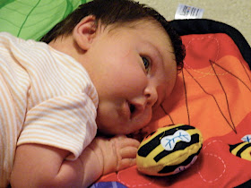 Another gift that we received when AppleBlossom was born from some coworkers of my husband was the Lamaze Spin and Explore Mat. You gotta love this ladybug! The leaves near the earthworm and the wings of the butterfly crinkle and they are definitely the favorite parts for AppleBlossom, yet more and more she is finding another interesting piece. She cannot squeeze it, but she loves to hear me squeeze the birdie who will then chirp for her. Also she loves to hear the bumblebee buzz his rattle. Then it almost goes without saying how she is enjoying the mirror. At first she would just be still and look, now she grasps the mat and kicks with her legs and pulls herself round. It is so fun to watch her learn and grow!